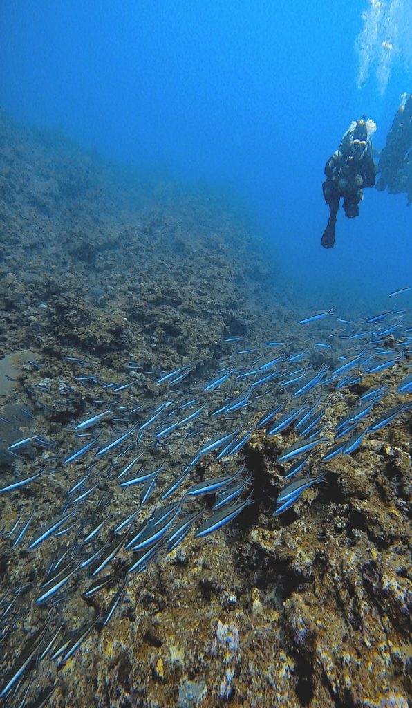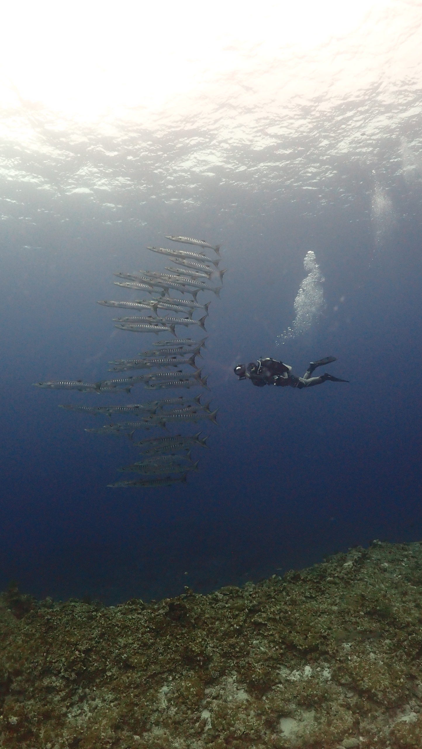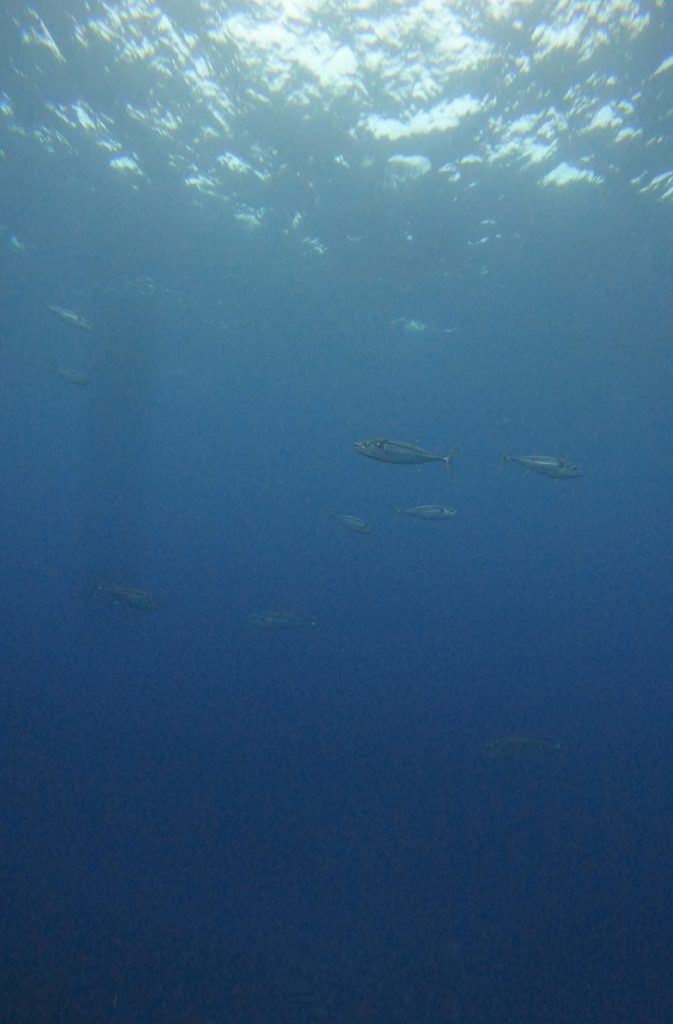 水底を見下ろすと、ギンガメアジの群れ。さらに横を見るとバラクーダ、そしてイソマグロ(トカキン)。