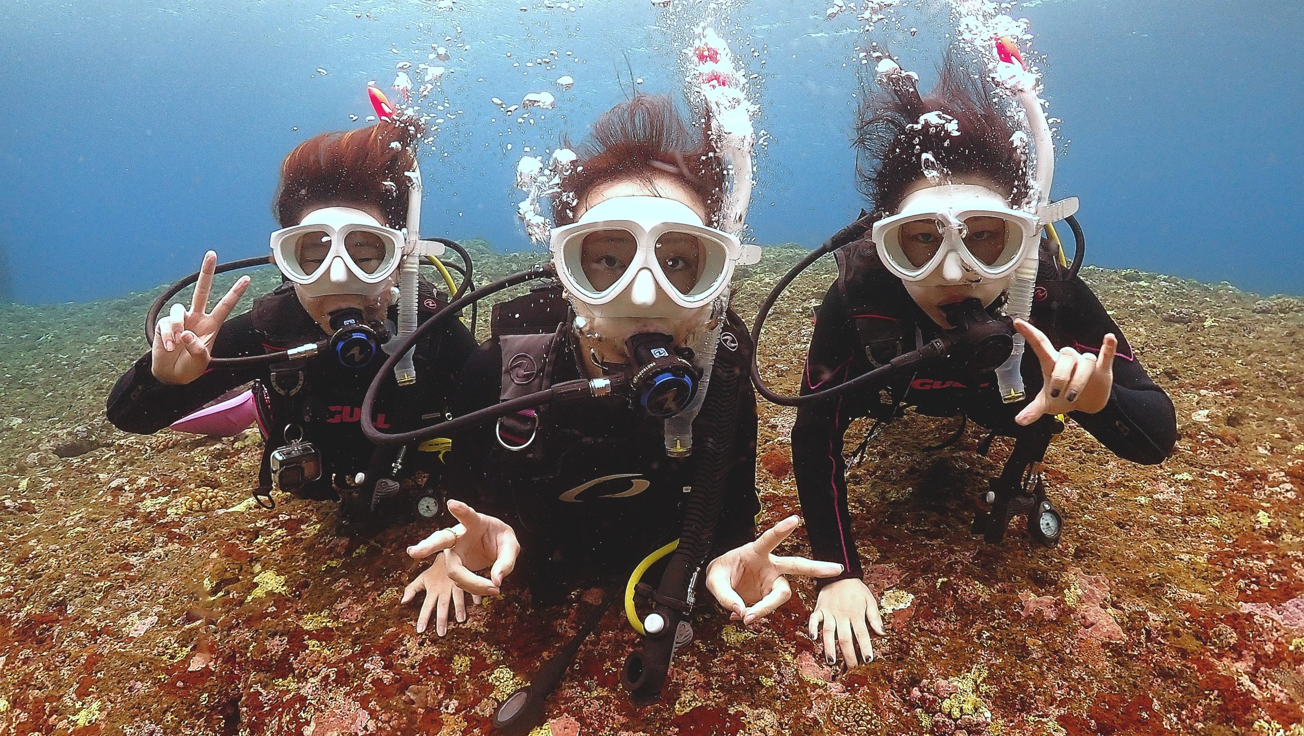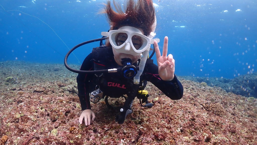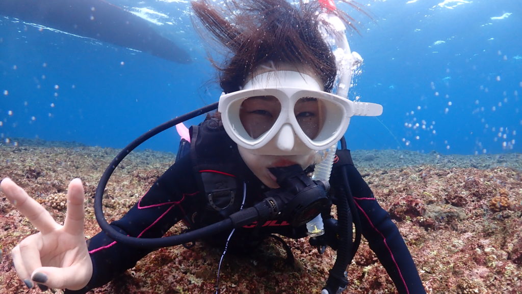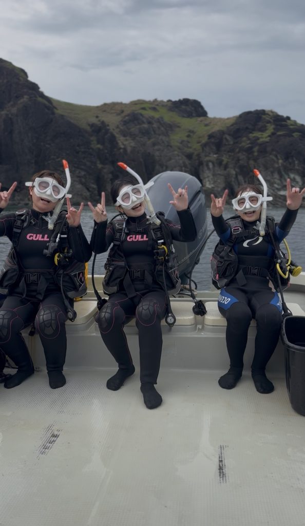 本日のゲストは、埼玉からお越しの仲良し三人組の女子旅グループ。お一人はライセンス取り立てのダイバー、そしてお二人は体験ダイビング。せっかくの旅行ですから、三人一緒にレッツゴーです。