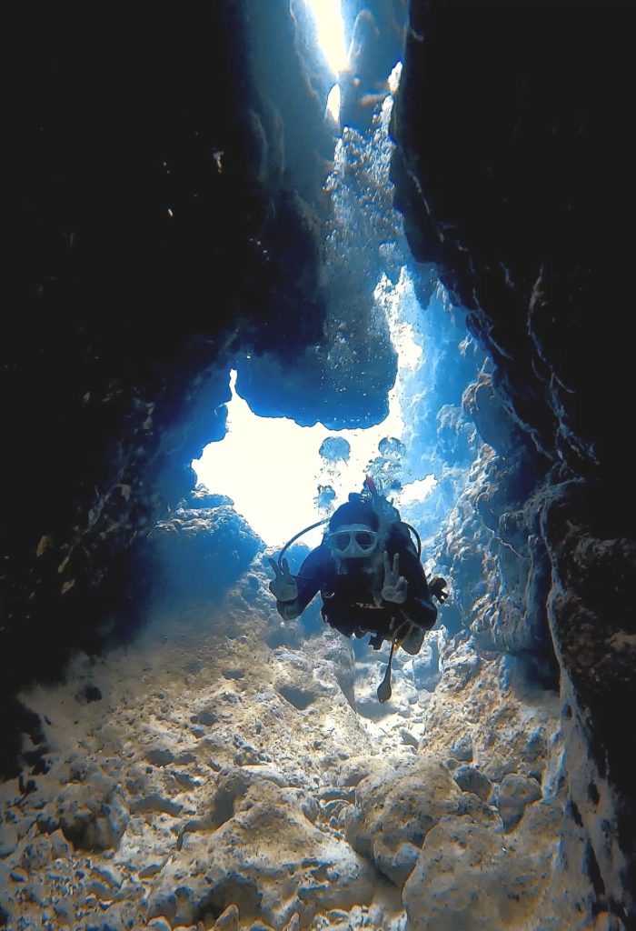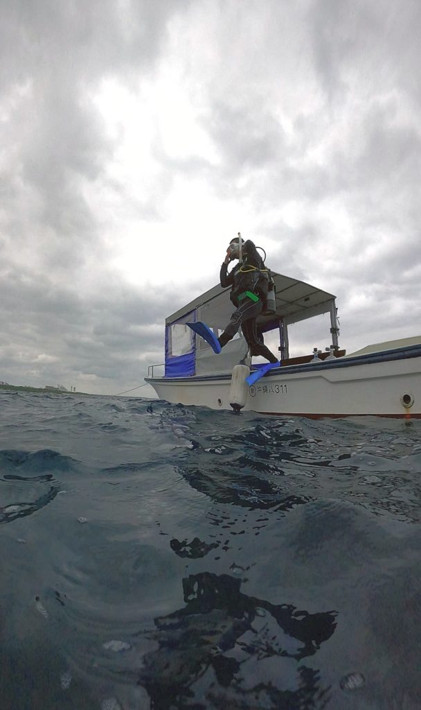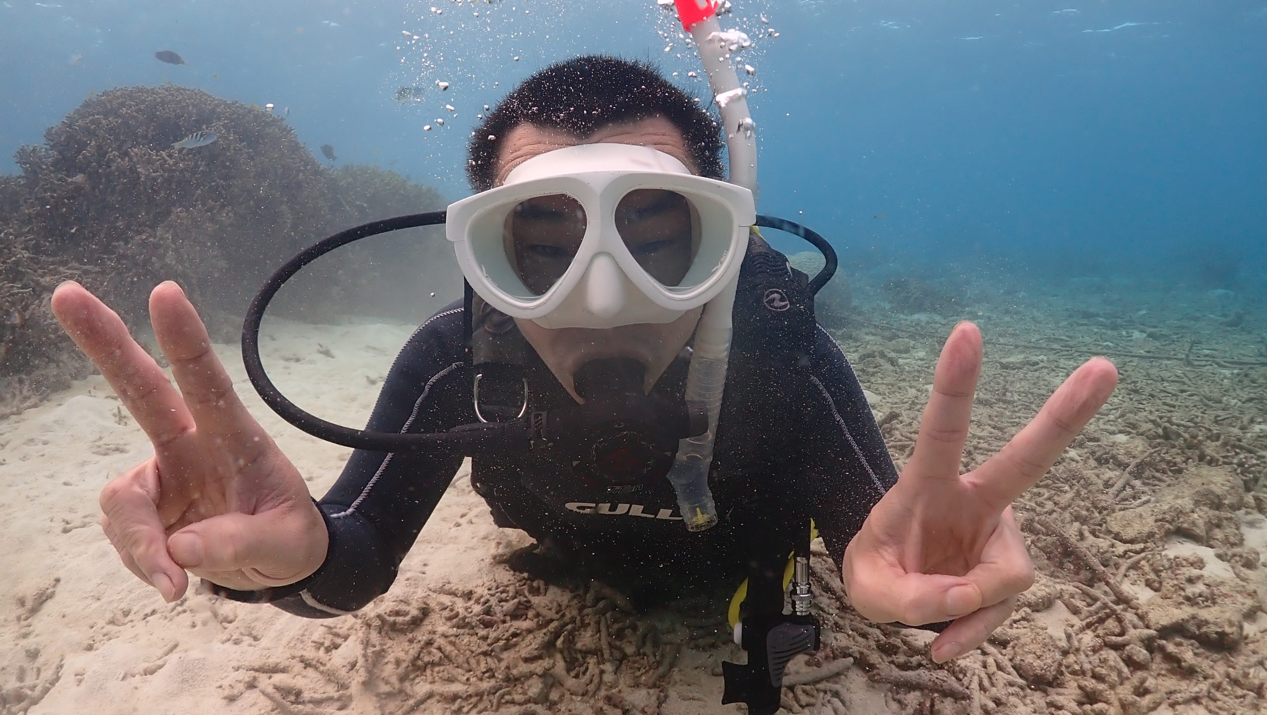 これまでの浅場とは違い、視界いっぱいに広がる“圧倒的な水の量”。水中世界のスケール感に、思わず見上げてしまうほど感動されている様子でした。体調も安定していたため、最後はオプションでファンダイビングへ挑戦することに。